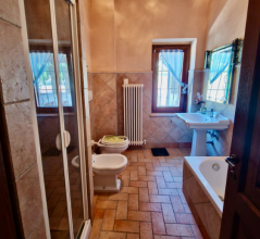 The portion for sale has a floor area of approximately 110 square meters spread over two levels. The ground floor comprises an entrance hall with a large storage room, a spacious living room with space for a pellet stove, a kitchen overlooking the garden, and a bathroom. The upper floor comprises two spacious bedrooms, each with a terrace, a bathroom with a bathtub and shower, and a large covered terrace perfect for outdoor dining. This property features high-quality finishes with Sassi di Assisi stone, terracotta floors, mosquito nets, and air conditioning.